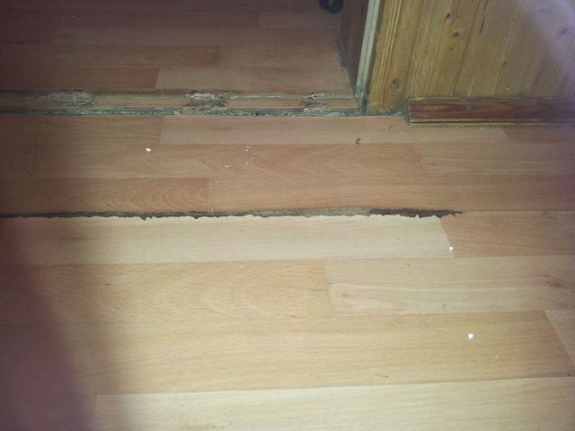 Durch einen Wasserschaden aufgequollenes Laminat bis in die Mitte des Zimmers.